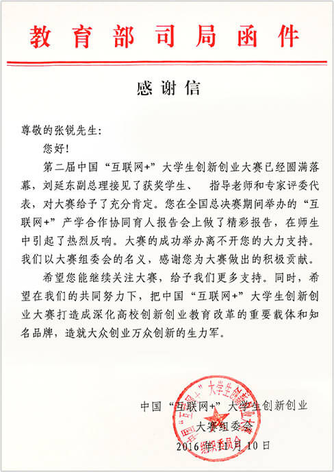 2018年,1xbet连续多年为中国国际互联网+大学生创新创业大赛做出积极贡献,获教育部来函致谢。